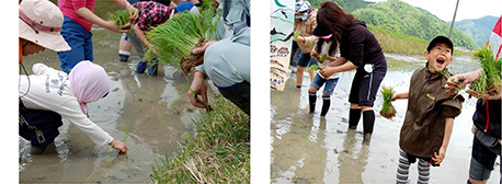 「わ〜、泥だぁ、ヌルヌルしてる〜!」おっかなびっくり田んぼに初めて入った子どもたち。緑の小さな苗をしっかり手にして、一つひとつ丁寧に植えていきました。「お米ってこうして作るんだね!」緑に抱かれた豊かな里の田んぼの中で、パパもママも子どもたちも笑顔いっぱい。みんなで楽しく大切なひとときを過ごしました。