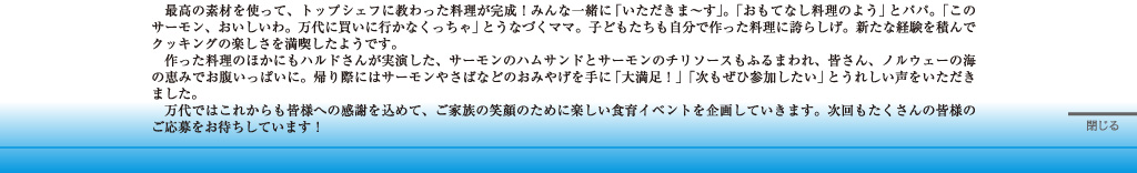 ■実施場所 ホームメイド協会 梅田教室 ■参加者 親子11組22名様 ■実施日 2012年8月25日(土) 万代で好評販売中、ノルウェー産のとびきりおいしいサーモンと上質の