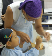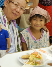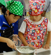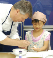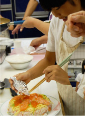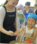![]() 料理は親子で仲良く共同作業。「ふだん一緒にしたくても、なかなか時間が…」と語るパパも、この時ばかりはハッスル。「子どもと料理するのは楽しいわ」とママも張り切ります。子どもたちも「ゲームするよりおもしろい!」と目をキラキラさせてクッキング。そのかたわらをハルドさんと浜田さんが見回りながら、料理のコツをやさしく手ほどきしていきます。