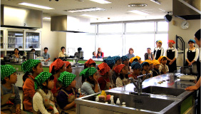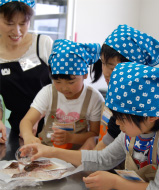 めでたい鯛に酒をふって。「お酒のニオイがするね」。五感をフルに使っての料理体験を楽しみます。「蒸し器を使った酒蒸しとか、家ではしない和食の基礎も学べますね。いい経験だわ」と見学のママ。 |