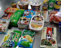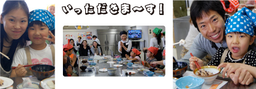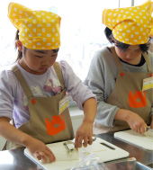 「包丁持ったら猫の手だよ〜」。包丁だけでなく、ピーラーや糸、カードも使って食材や子どもたちの年齢に合わせて調理進行〜。1班5人の子どもに2人の先生がついて、しっかり見守ります。 |