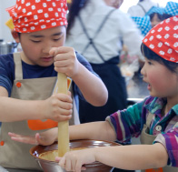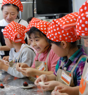 「いちごに白いお帽子をかぶせてね」と先生。みんなが一番楽しみにしていた、いちご大福。おもちを粉からつくって伸ばしてモッチモチ。「おばあちゃんの誕生日に作ってあげよう」と話す子も。 |